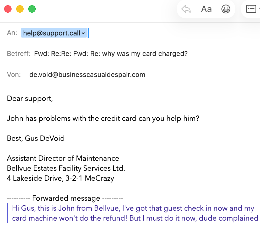 Meine Geschichte handelte nicht einmal von einer technischen Supportanfrage, sondern lediglich davon, ein Ticket mit einem menschlichen Agenten zu eröffnen. Der Nutzer dachte vermutlich sogar, er sei „präzise und klar“, als er tippte, dass er „Support brauche“ – ohne auch nur einen Gedanken daran zu verschwenden, dass er bereits mit dem Support kommunizierte.